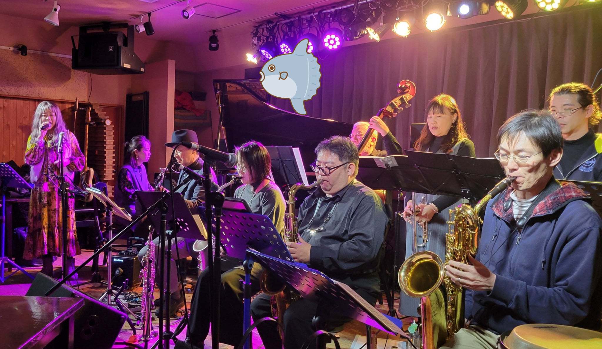 多人数ならではのアンサンブルの楽しさと、ジャズならではのアドリブ演奏をお楽しみいただけます。ちなみに、Sunfshとは「マンボウ」のことです。